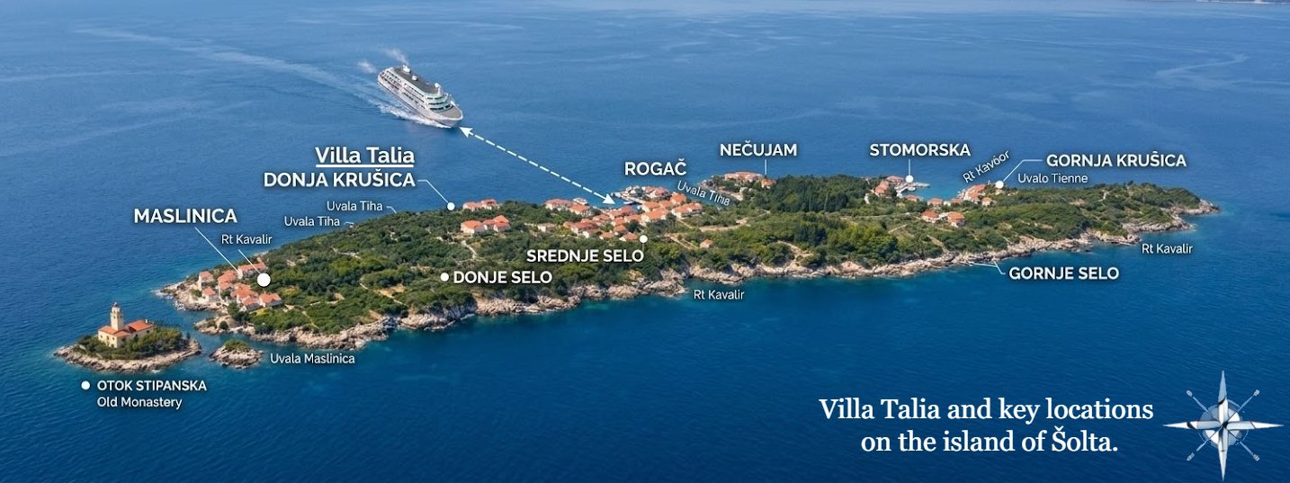 From Rogač, Villa Talia is about a 15-minute drive to the quiet bay of Donja Krušica. If you need any assistance with directions before arrival, we are always happy to help.